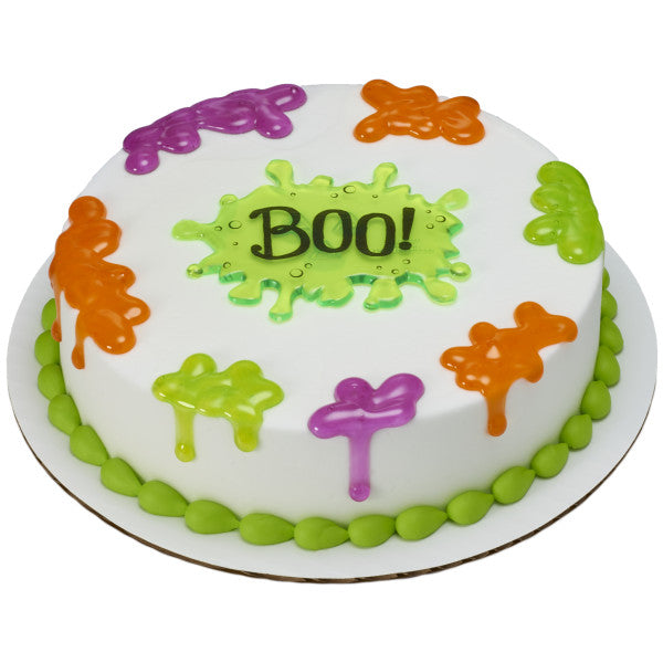 Celebrate a spectacular Halloween with this fun and festive cake design. Featuring the Halloween Slime Sayings Layon decorations. Great for use on cupcakes or enhancing the look of a cake.
